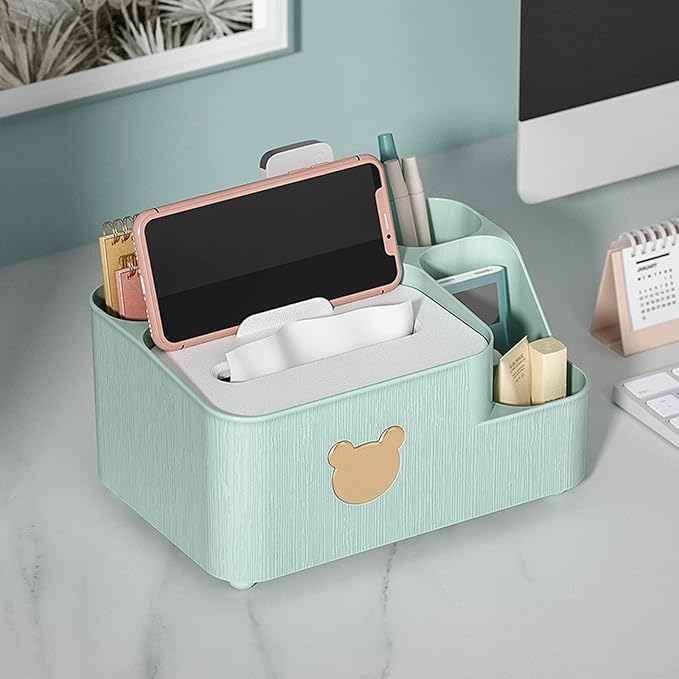 Multifunctional All-In-One Tissue Box: Simplify storage with this versatile tissue box. It features 3 partitions for tissue, phone, and miscellaneous storage. The upgraded design offers enhanced convenience. Side compartments provide space for remote controls, glasses, phones, pens, and more, keeping your desktop tidy.